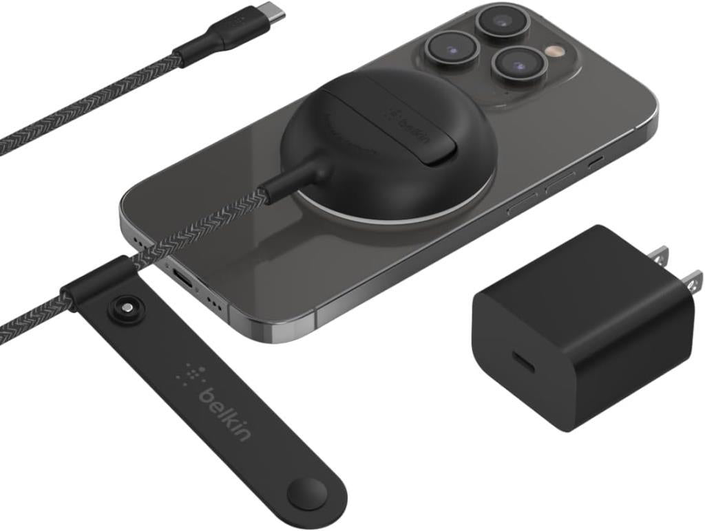 Belkin MagSafe için Kablosuz Şarj Cihazı, 15 W Hızlı Şarj Pedi (PSU Dahil Değildir), Tekme Standı ve 6.5ft Uzun Örgülü Kablo, iPhone 15, 15 Pro, 15 Pro Max, 14 ve 13 ve iPhone Mini ile Uyumlu - Siyah